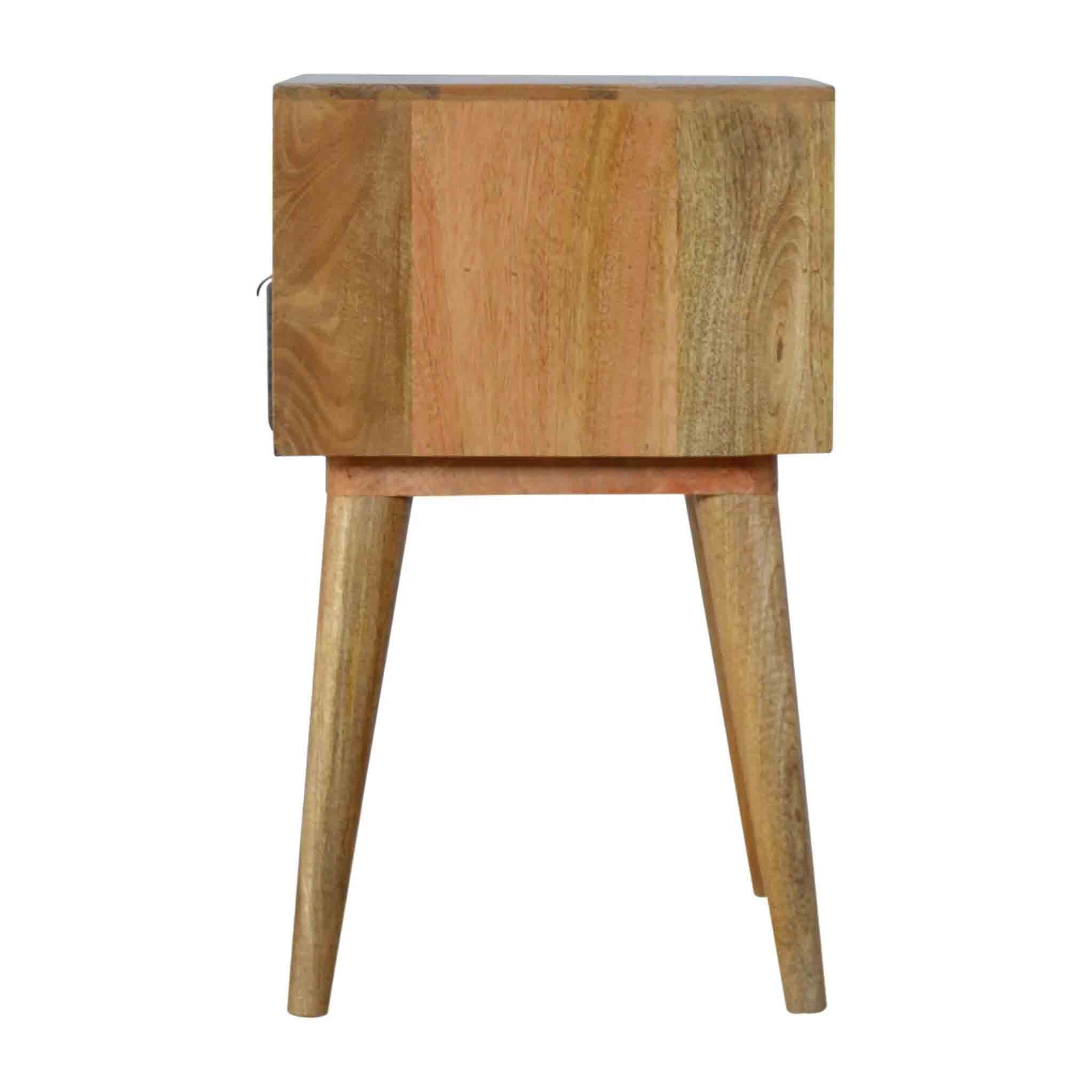 Finished with grey tweed fabric front drawers this bedside table takes a different twist on furniture by the contrast of 2 materials. It features a solid wood body finished so that would allow it to blend with oak items and a golden pull-out handle with 4 Nordic style legs. It is the perfect addition to both modern and country homes. It has a handy slot which can be used to place any bits and bobs like magazines or books you wish to keep nearby before bedtime.