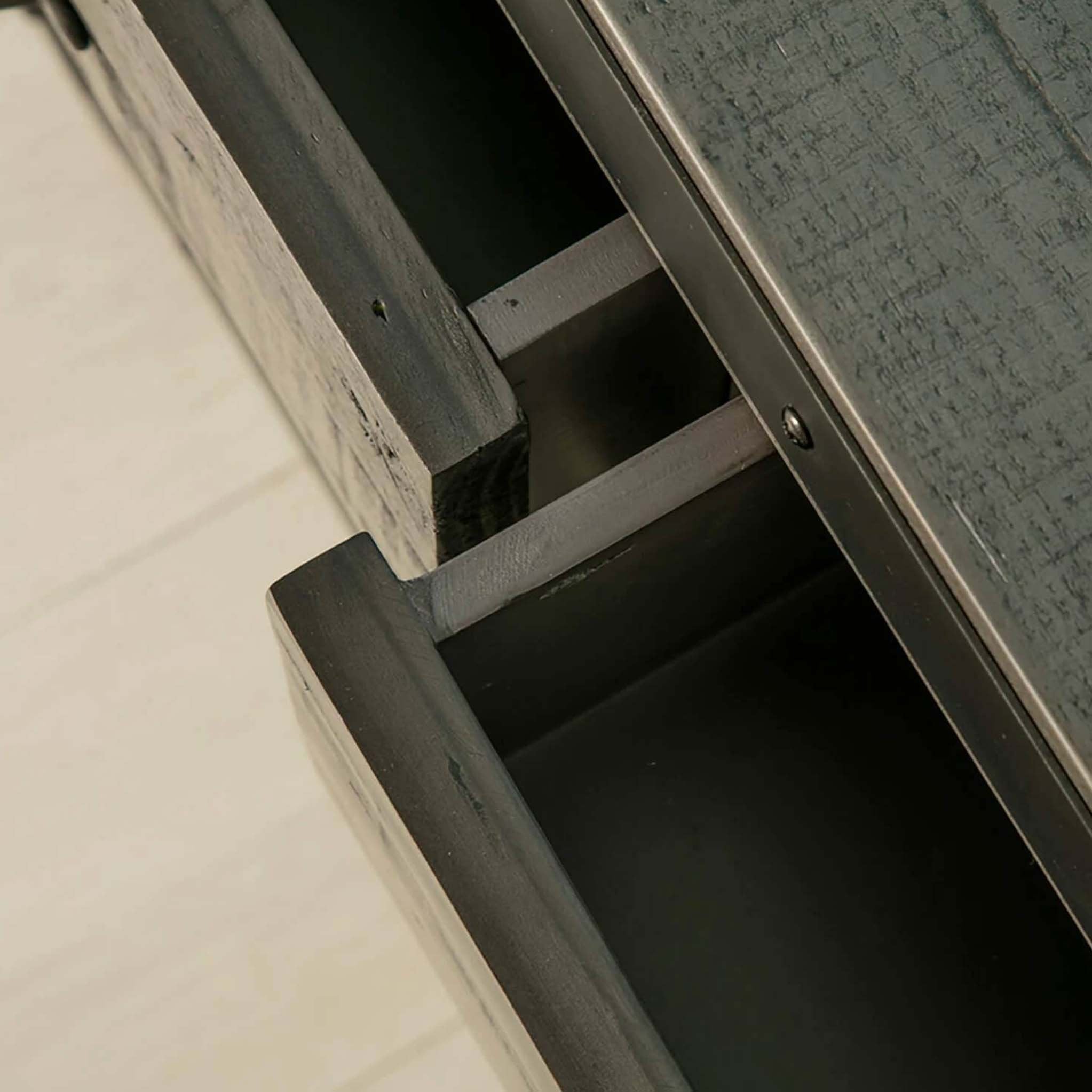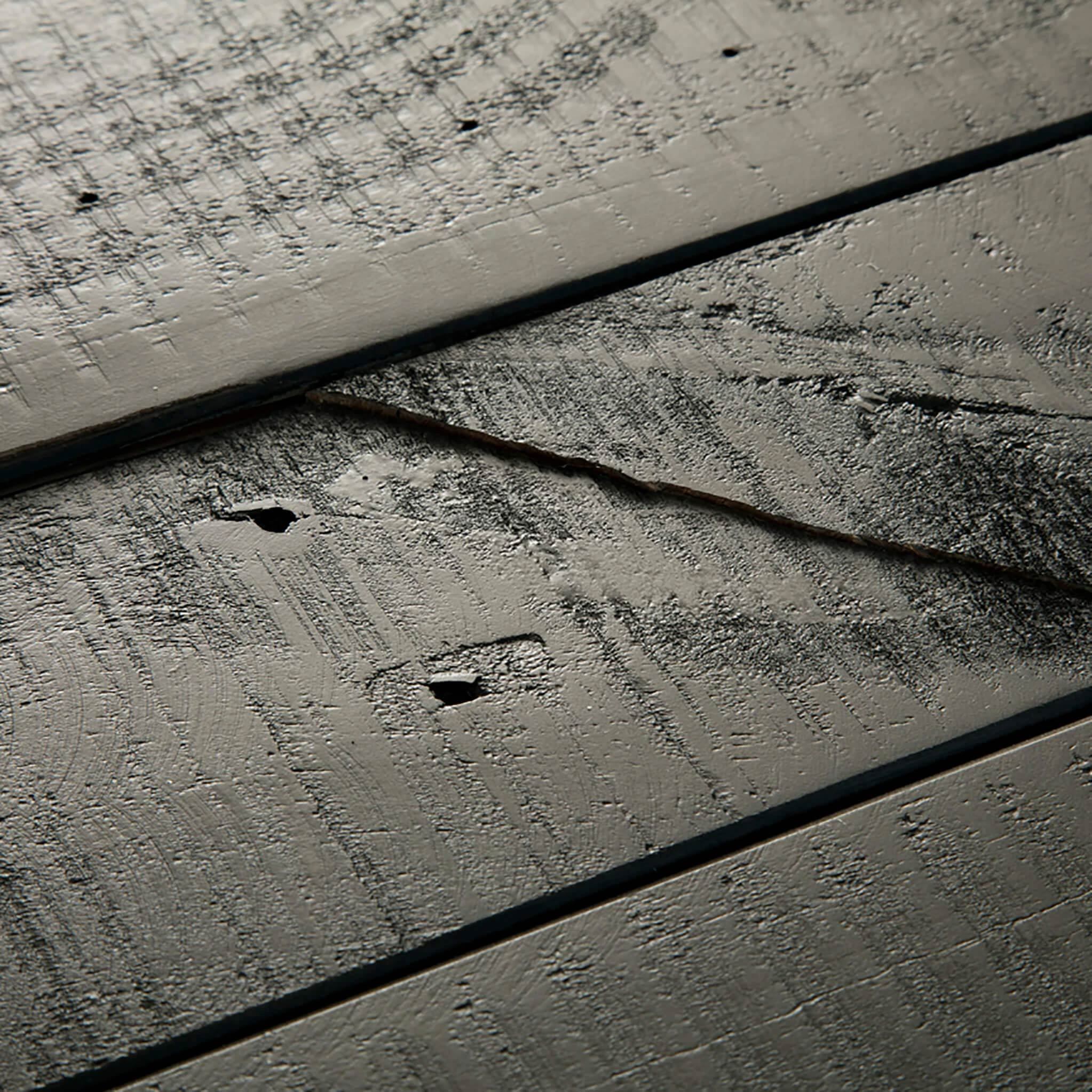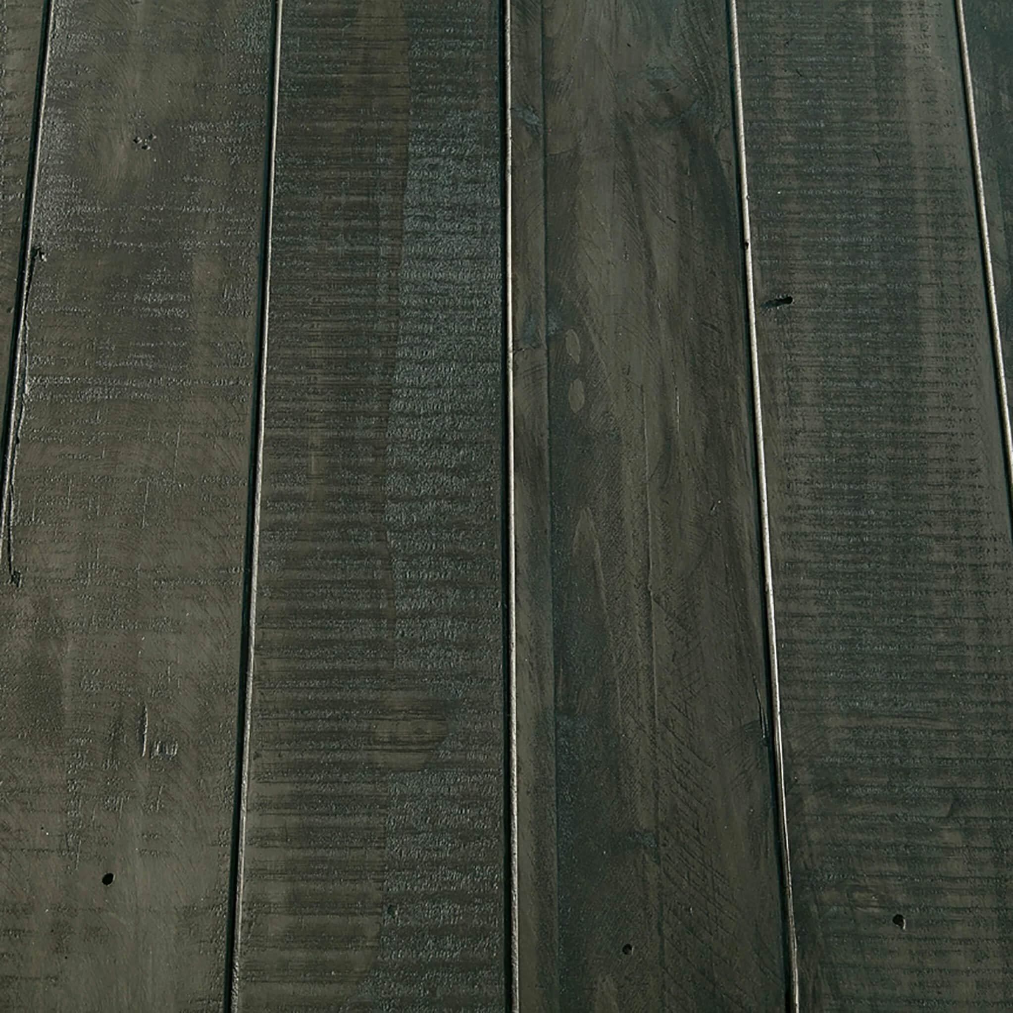 The base and tabletops are crafted from recycled pine, that has been finished in a weathered-grey hand-glazed lacquer, darkening the wood to complement the metallic style of the furniture while enhancing the character of the wood grain.
