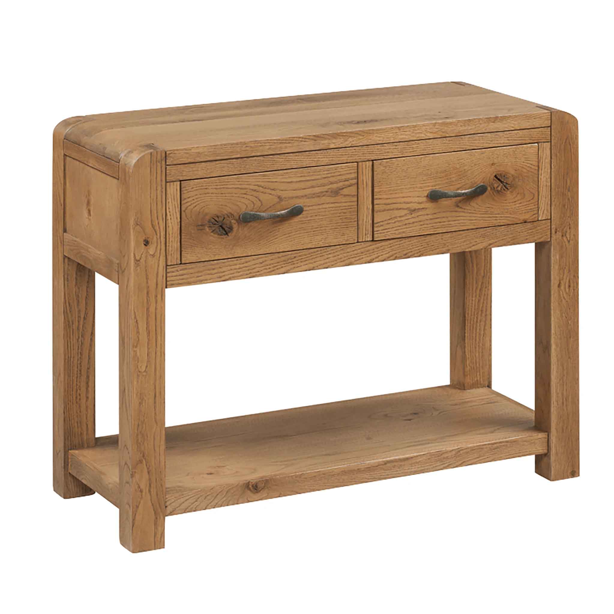 The Capri 2 Large Console Table is the perfect console tables from the Capri range. The 2 deep drawers offer plenty of storage space for the items that you want out of view, whilst the top and bottom shelf offer a beautiful platform to display the items that you want to. The warm tone and rounded edges of this piece will bring a rustic charm to any room.