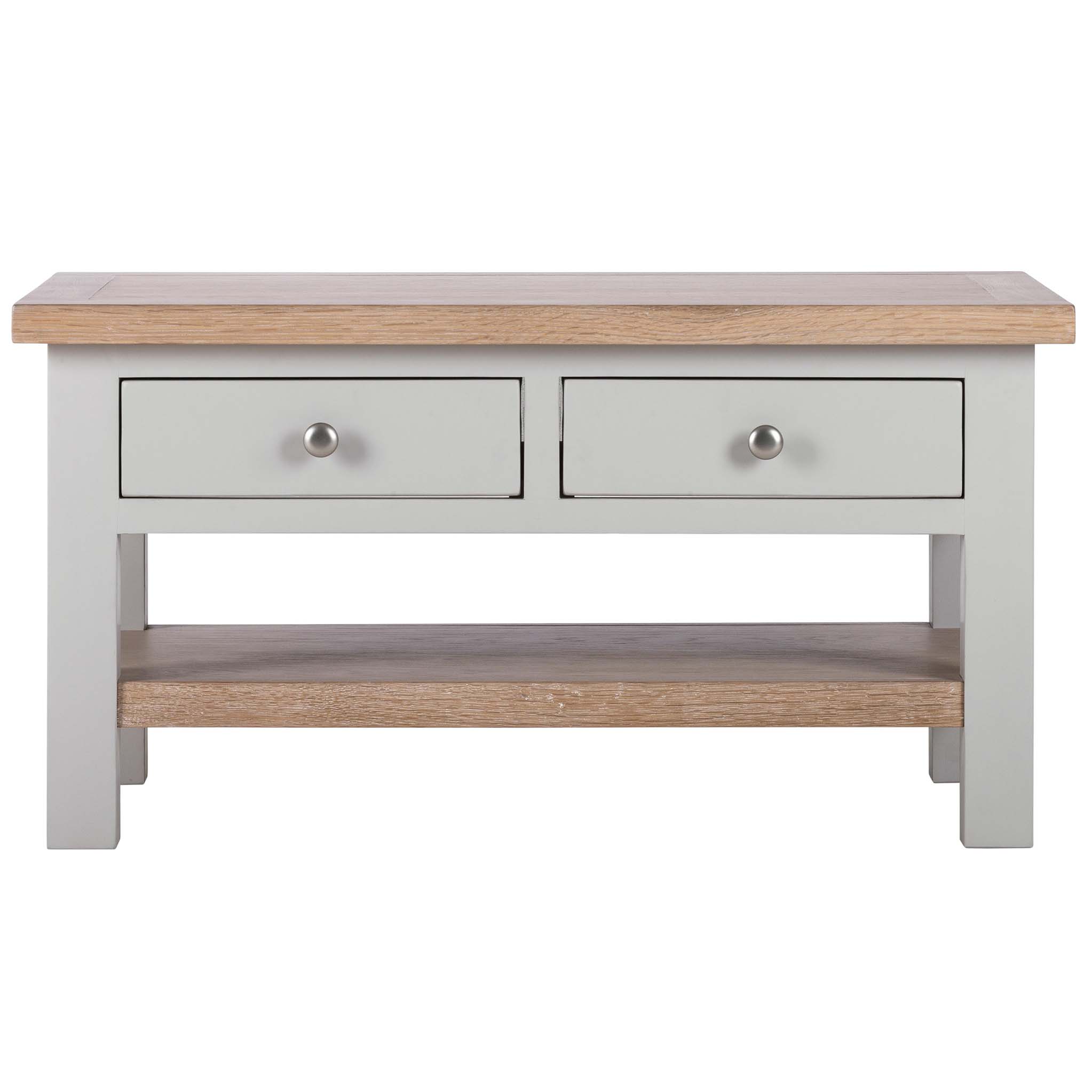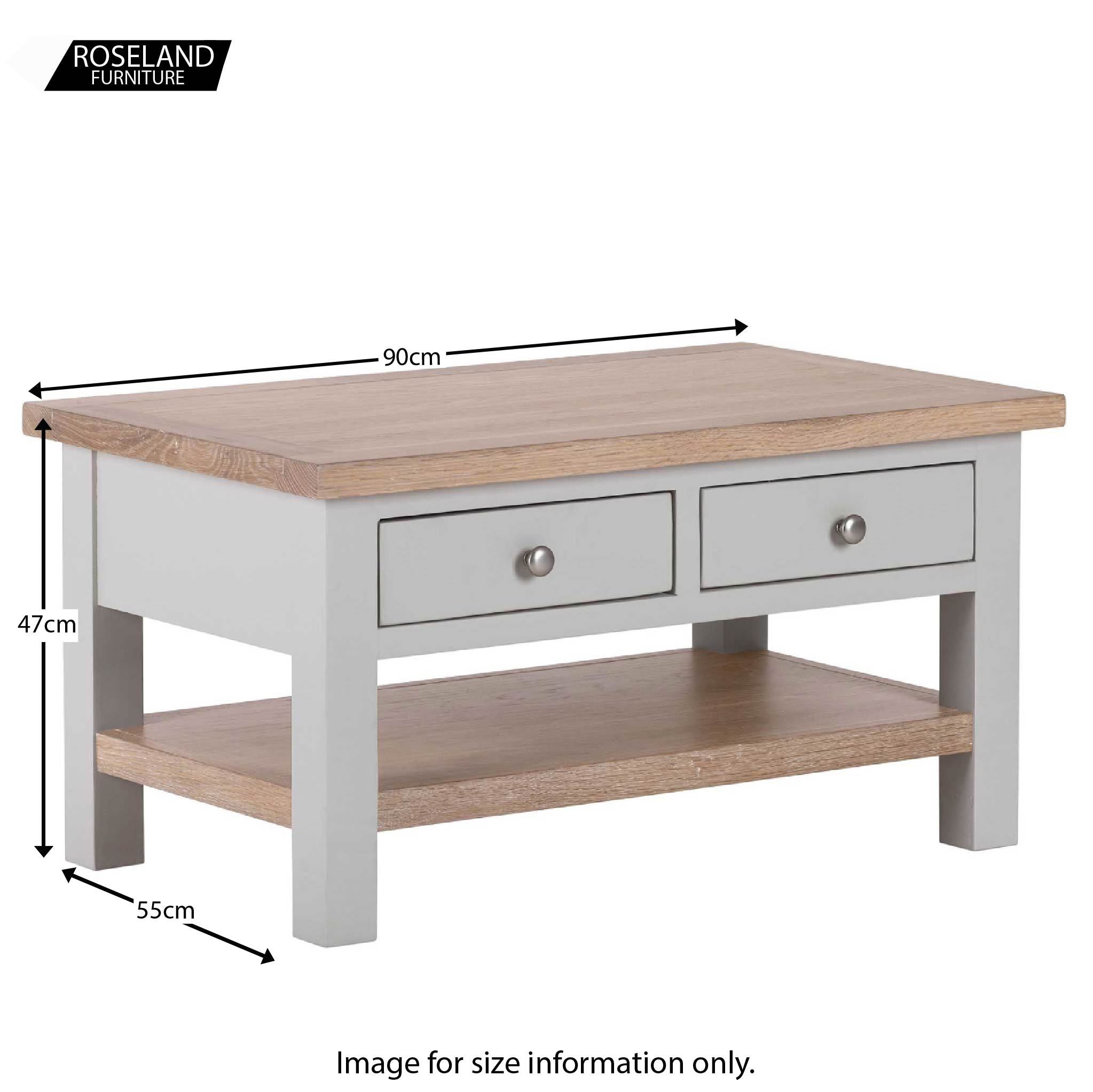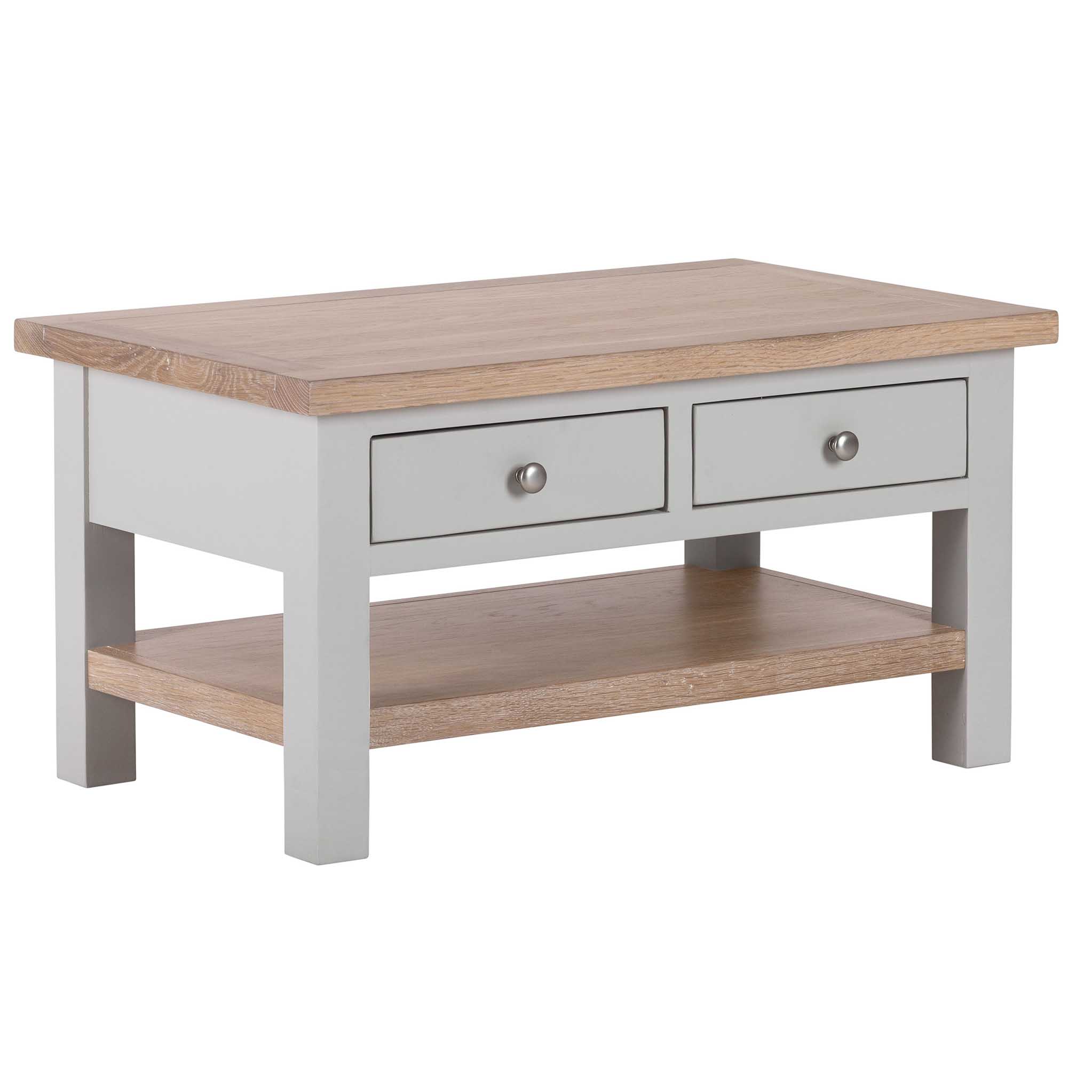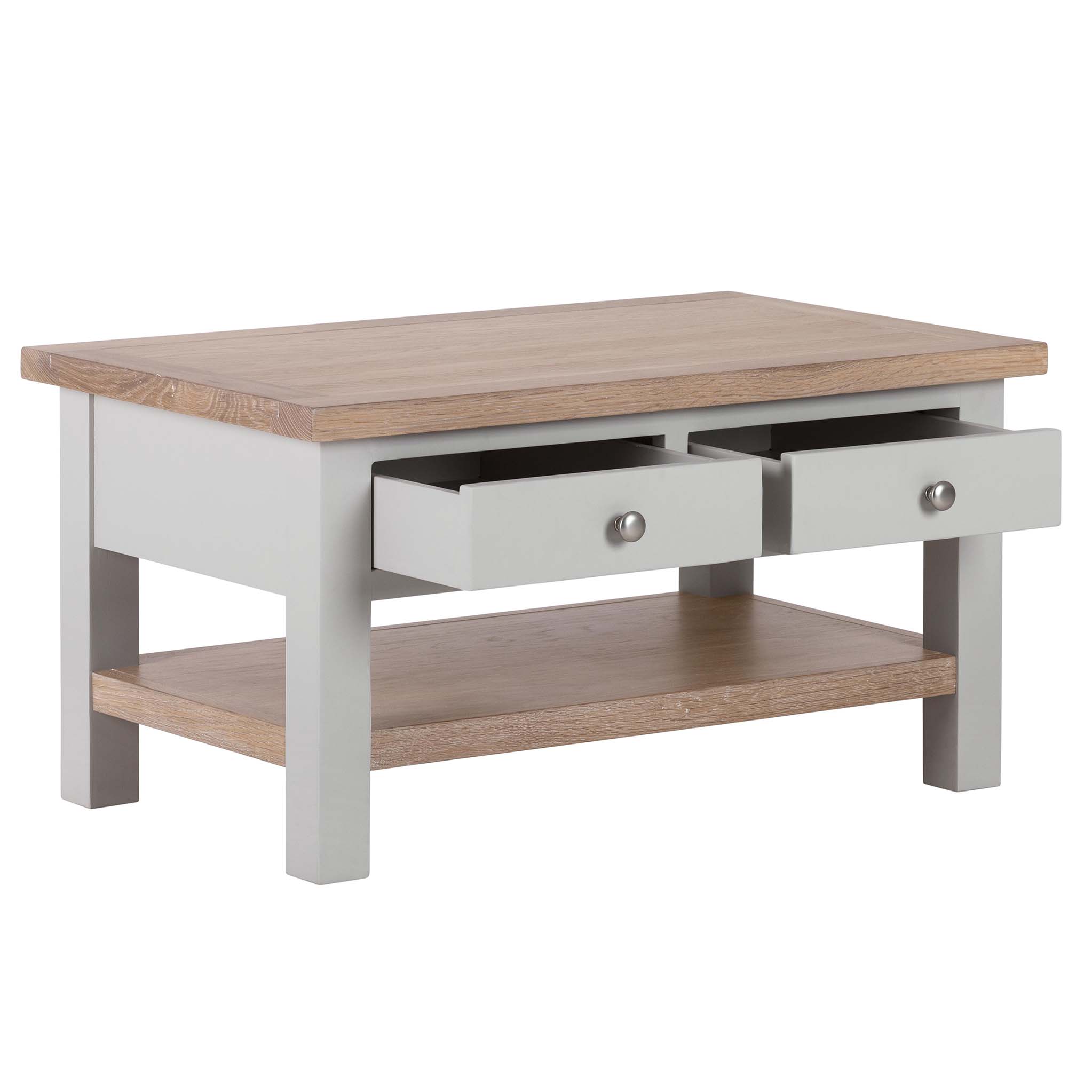 This stunning grey coffee table is a fantastic option for modern and traditional style homes alike. It features two drawers to store any small belongings and a lovely oak lower shelf for easy access to place books, remotes, and magazines.