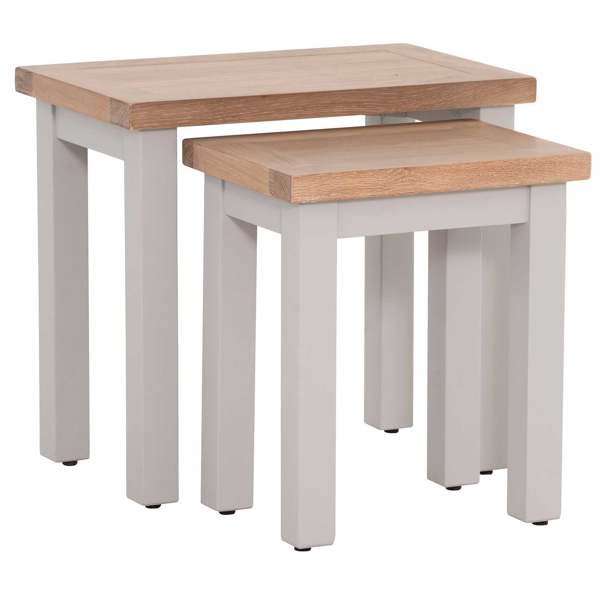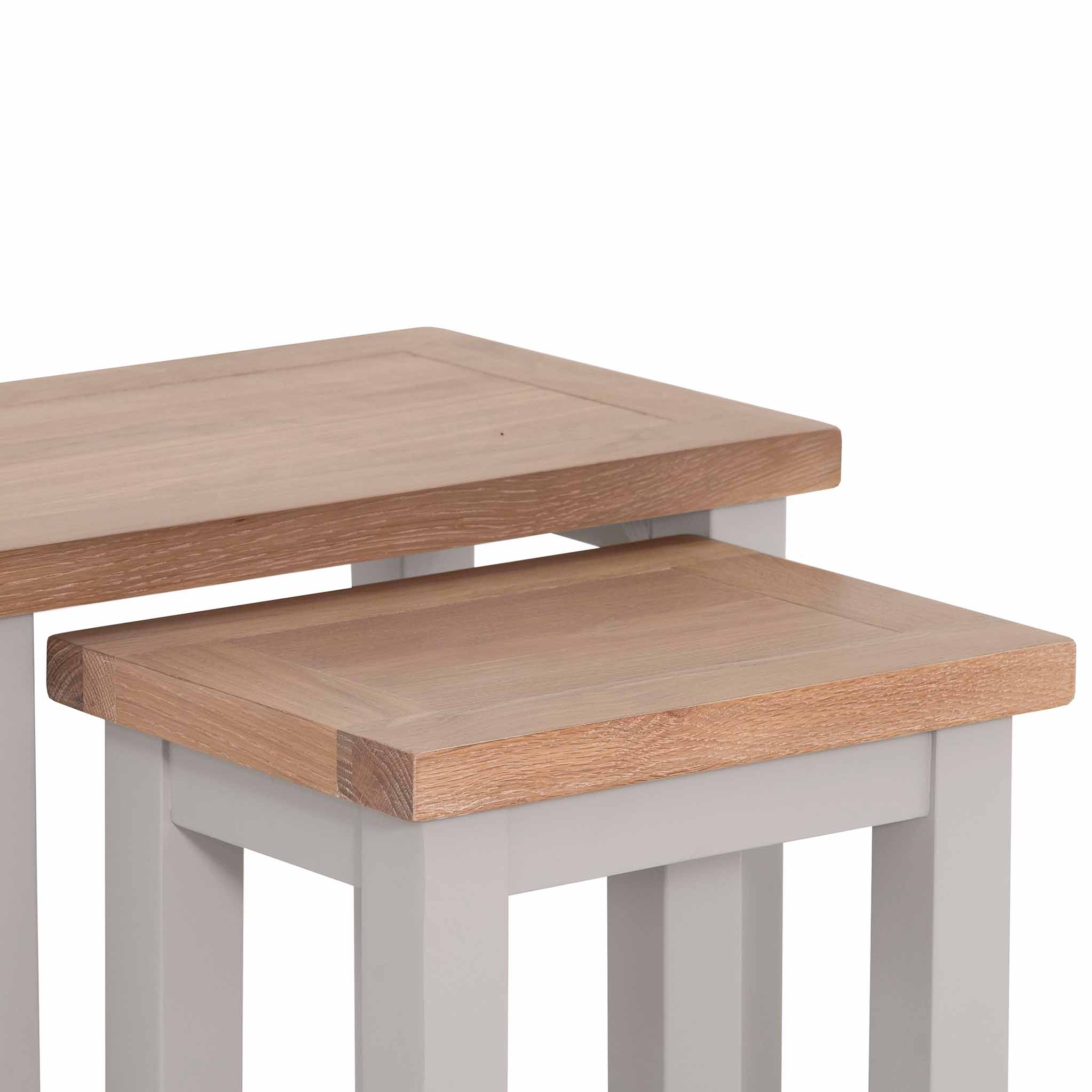 Crafted from solid oak and solid wood, the Charleston Grey nest of tables will add real quality to your home. The lacquered wooden frame has a clean design with a beautiful golden oak top and an on-trend light grey base.
