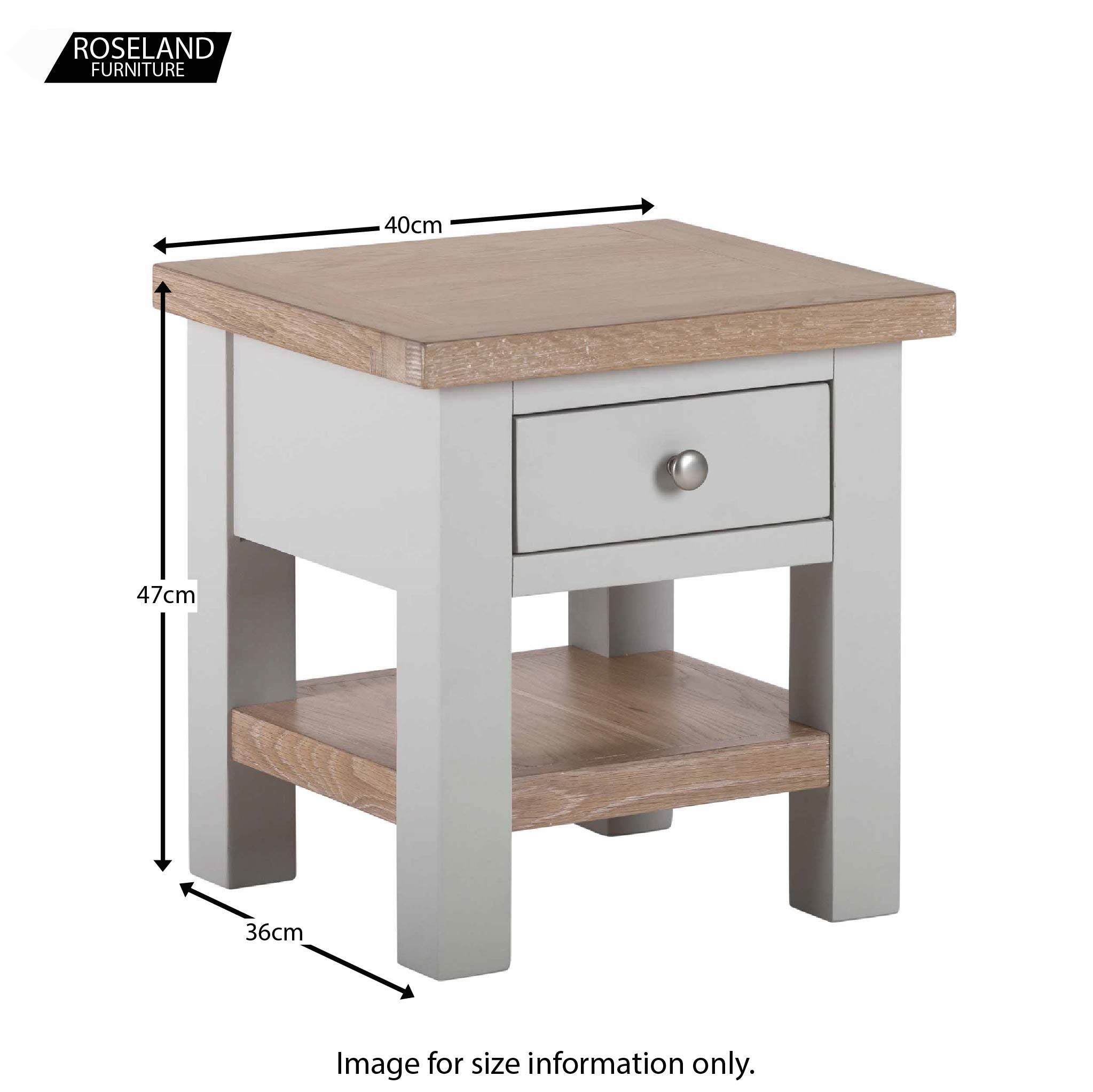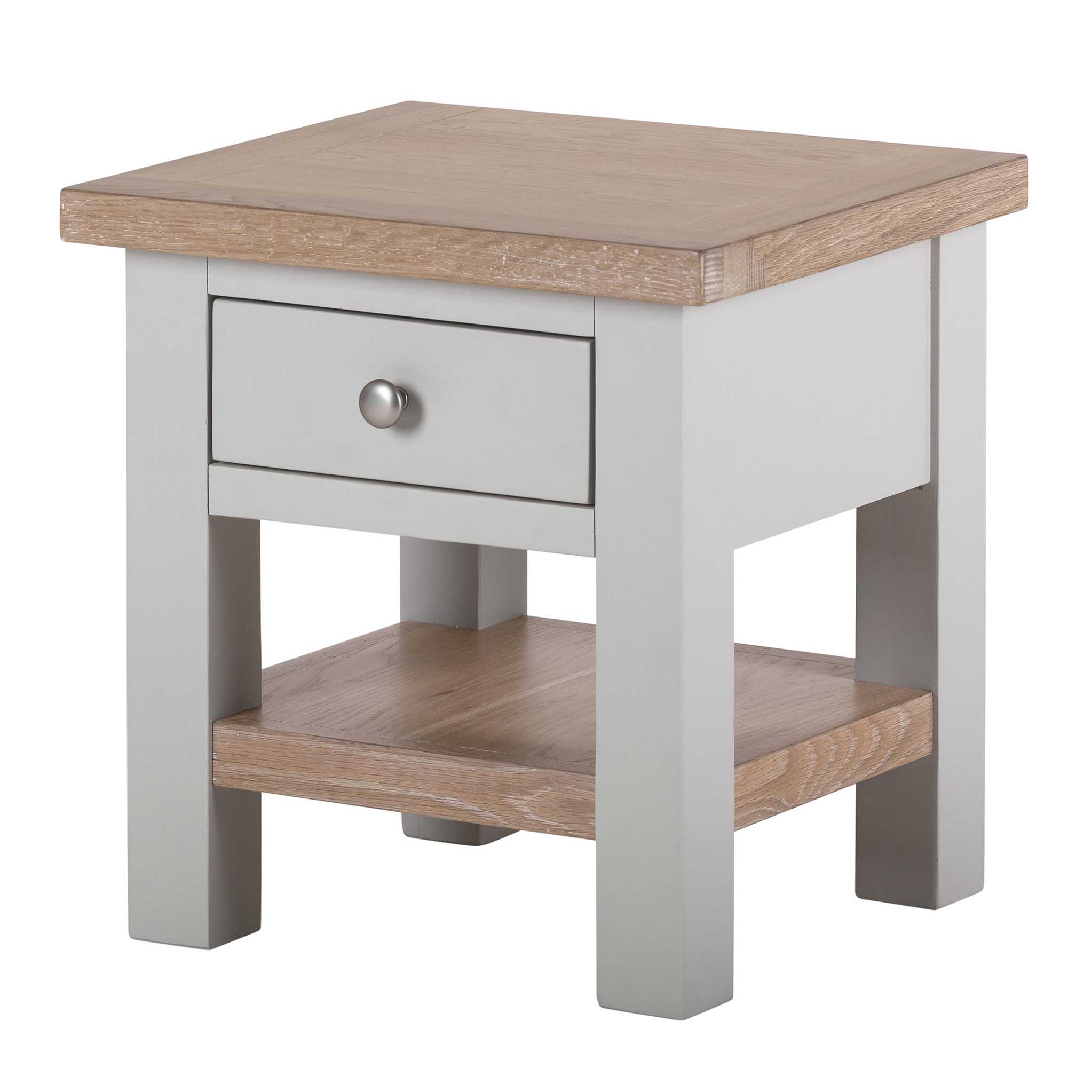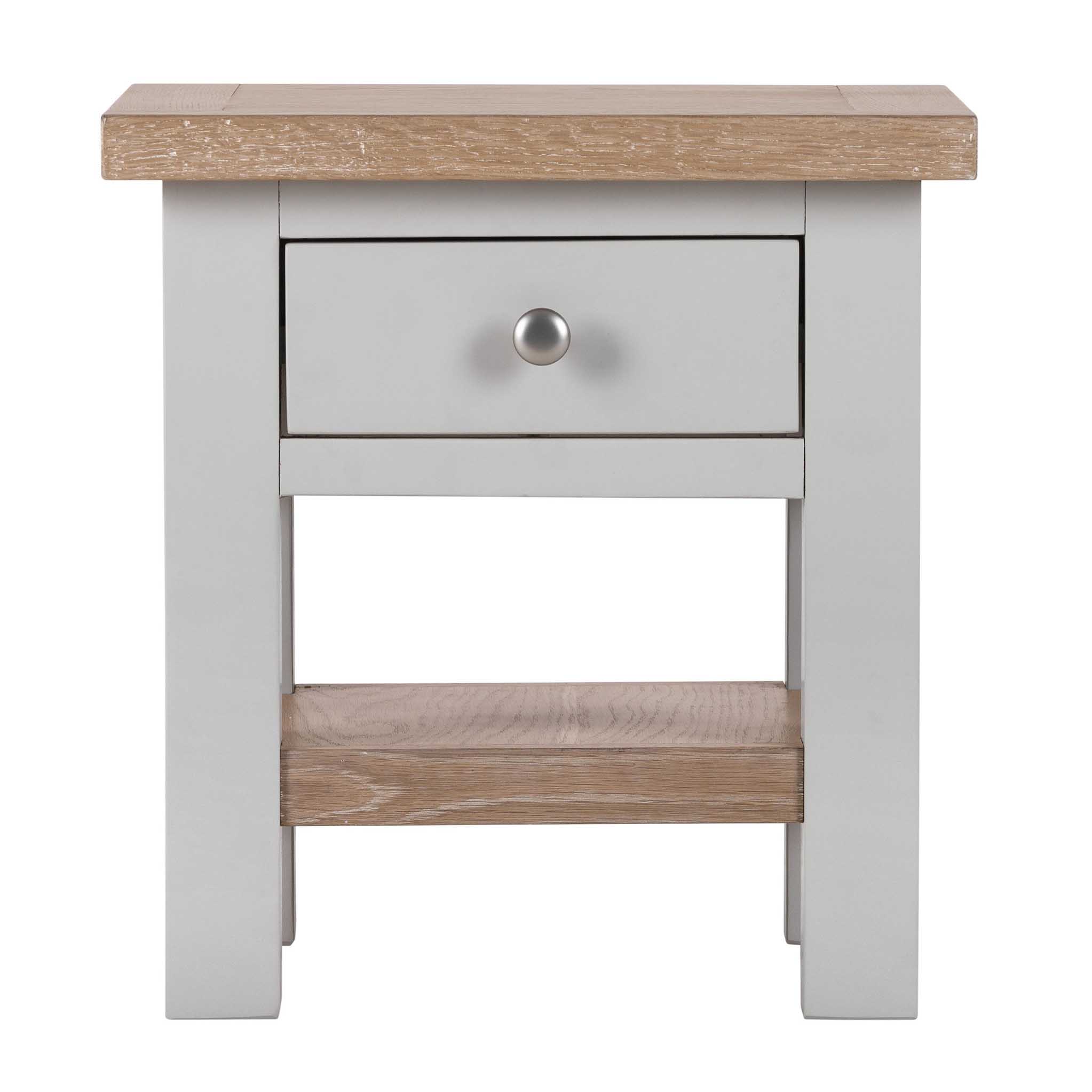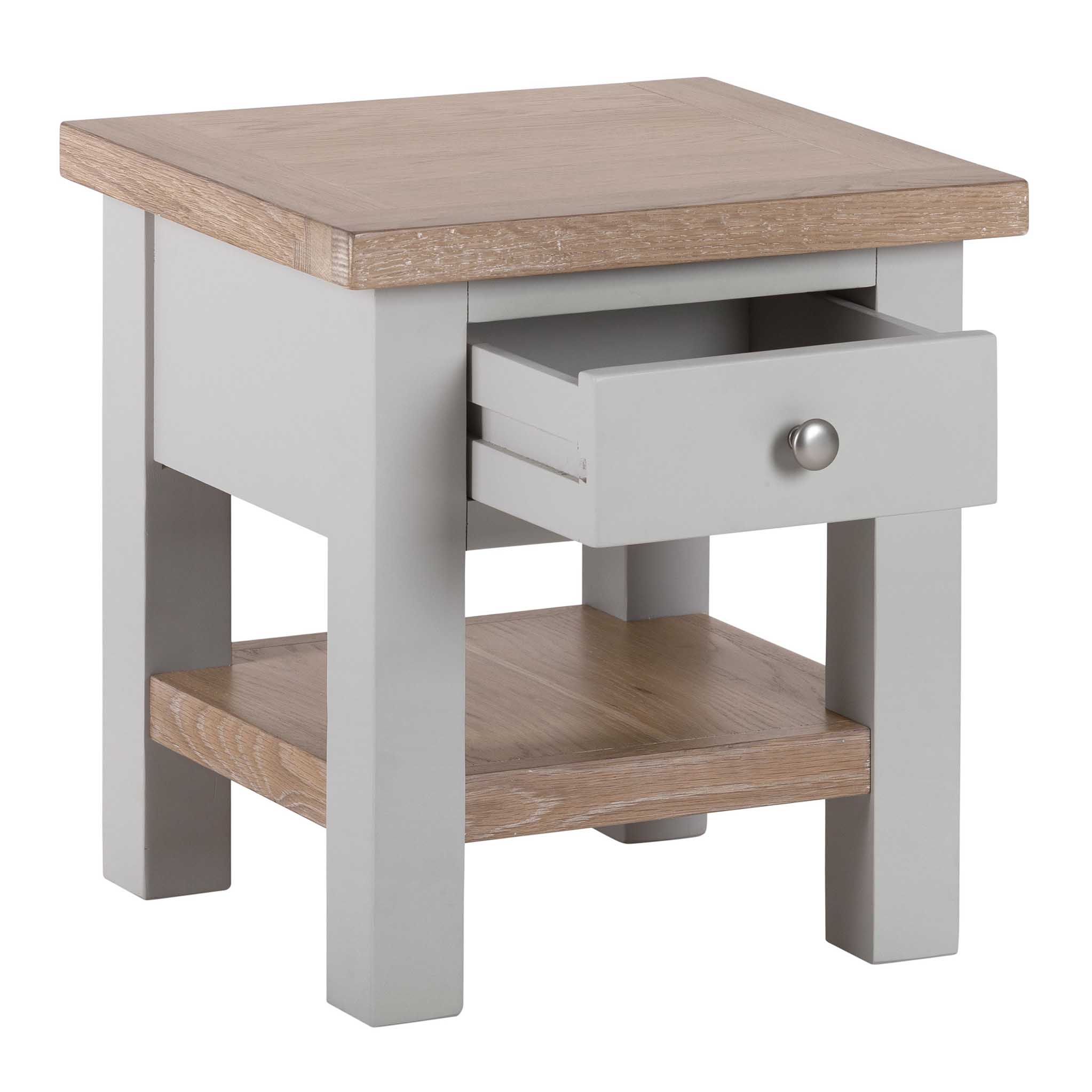 • The Charlestown Oak lamp table included a single drawer and shelf area.