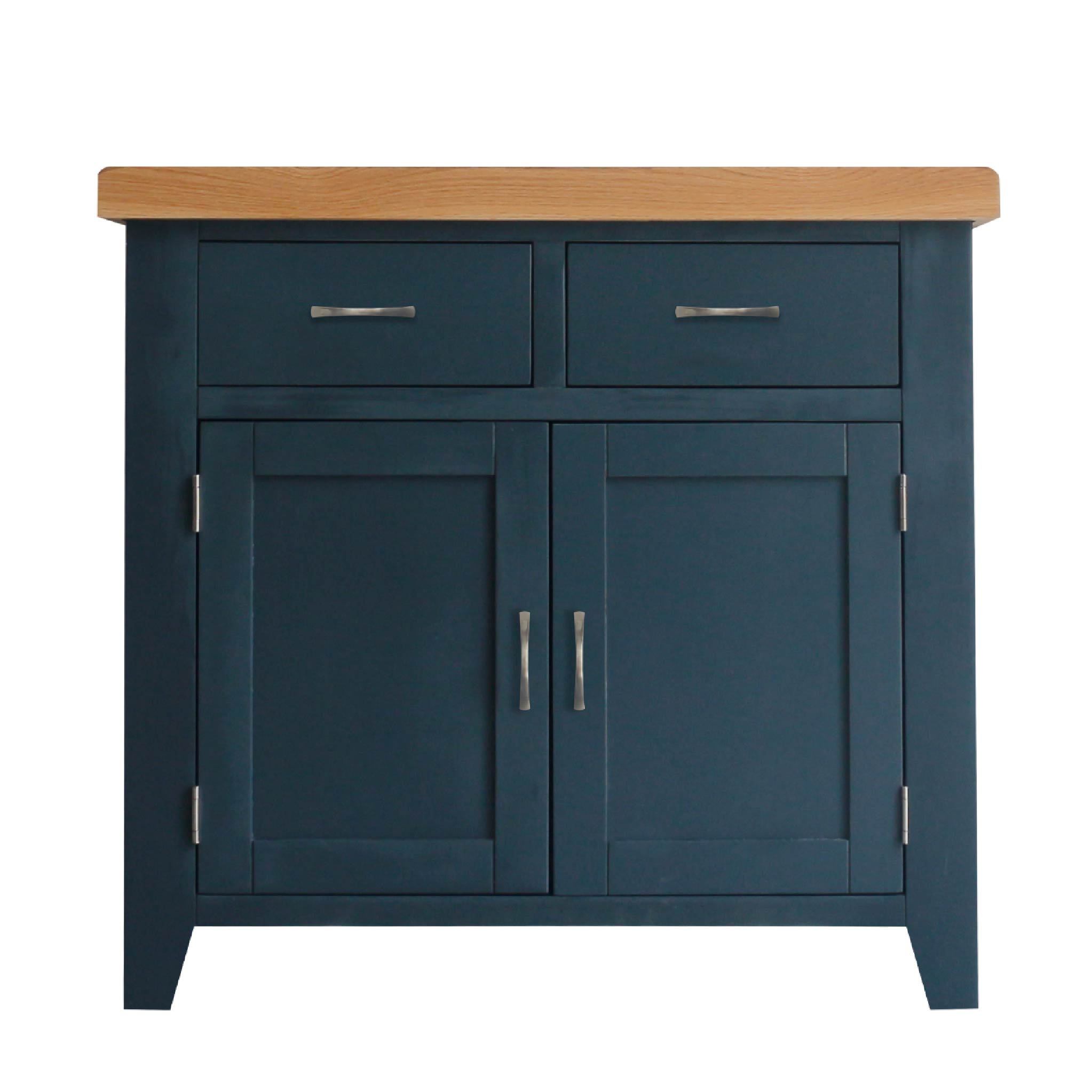 - This beautiful small sideboard is finished with dark blue paint and contrasting oak top.