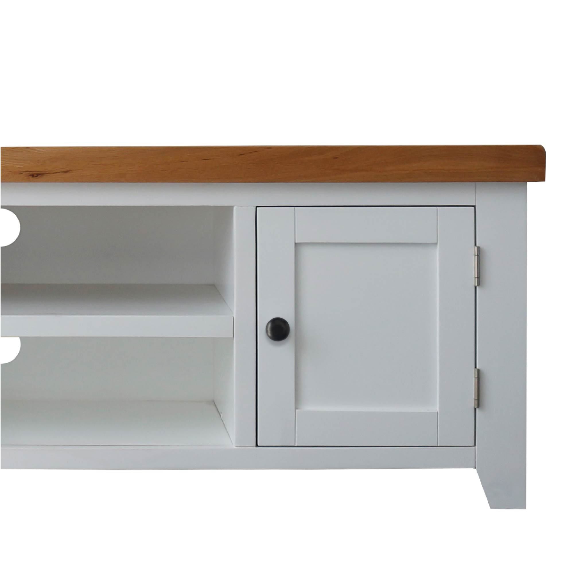 This stunning extra large white TV cabinet is a fantastic unit, it has 2 large cupboards for storage and 2 wide central shelves for any entertainment devices (Sky Box or Freeview player). This is certainly a unique, stylish, and functional piece of furniture