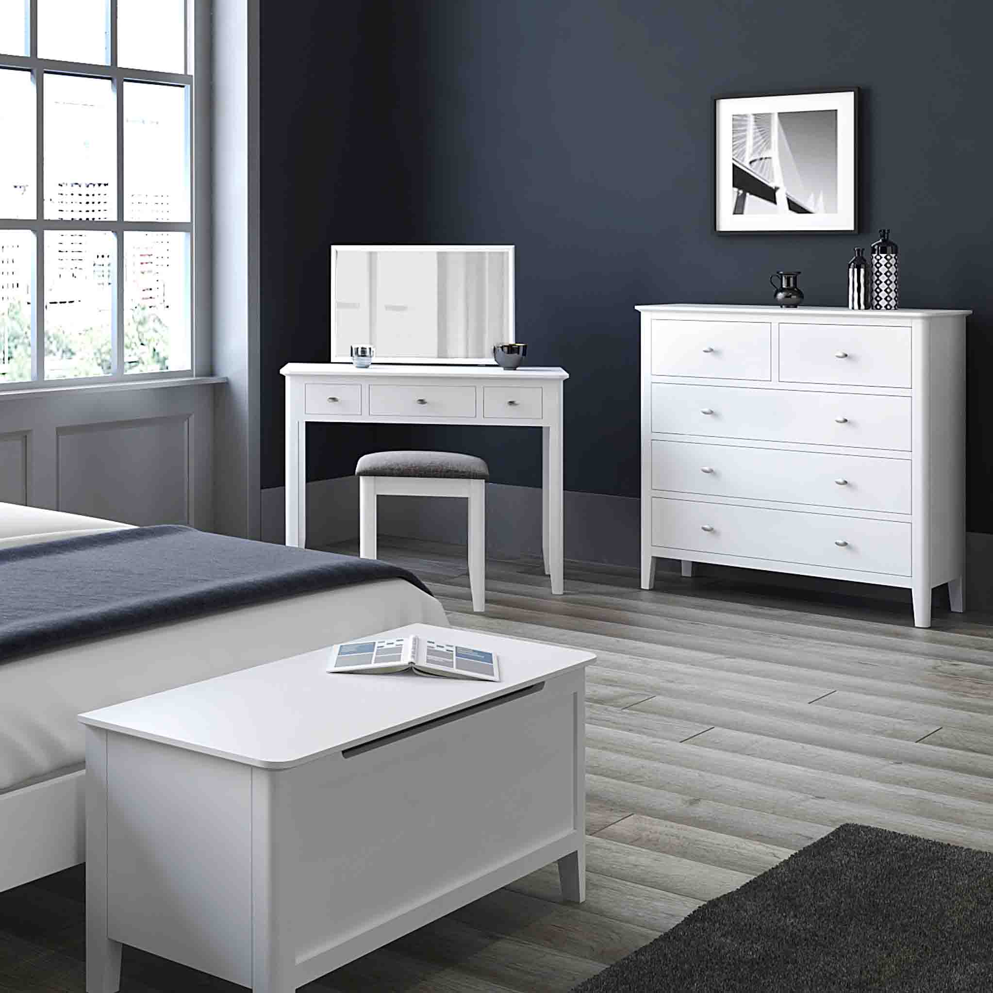 The Chester Collection of Bedroom Furniture offers a bright white finish with satin chrome handles, clean, crisp contemporary style & finish, perfect for the modern home. Simple lines & design make this range perfect for any interior design. Create your perfect bedroom with a modern update on a Scandi design.