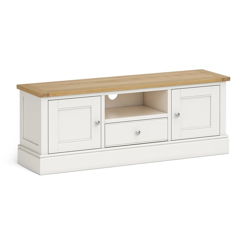One of four TV stands in the Chichester range. With two spacious cupboards and a lower central drawer, this TV unit provides plenty of storage space for DVDs, remote controls, cables and manuals. The central shelf has a cable hole to keep everything neat and tidy