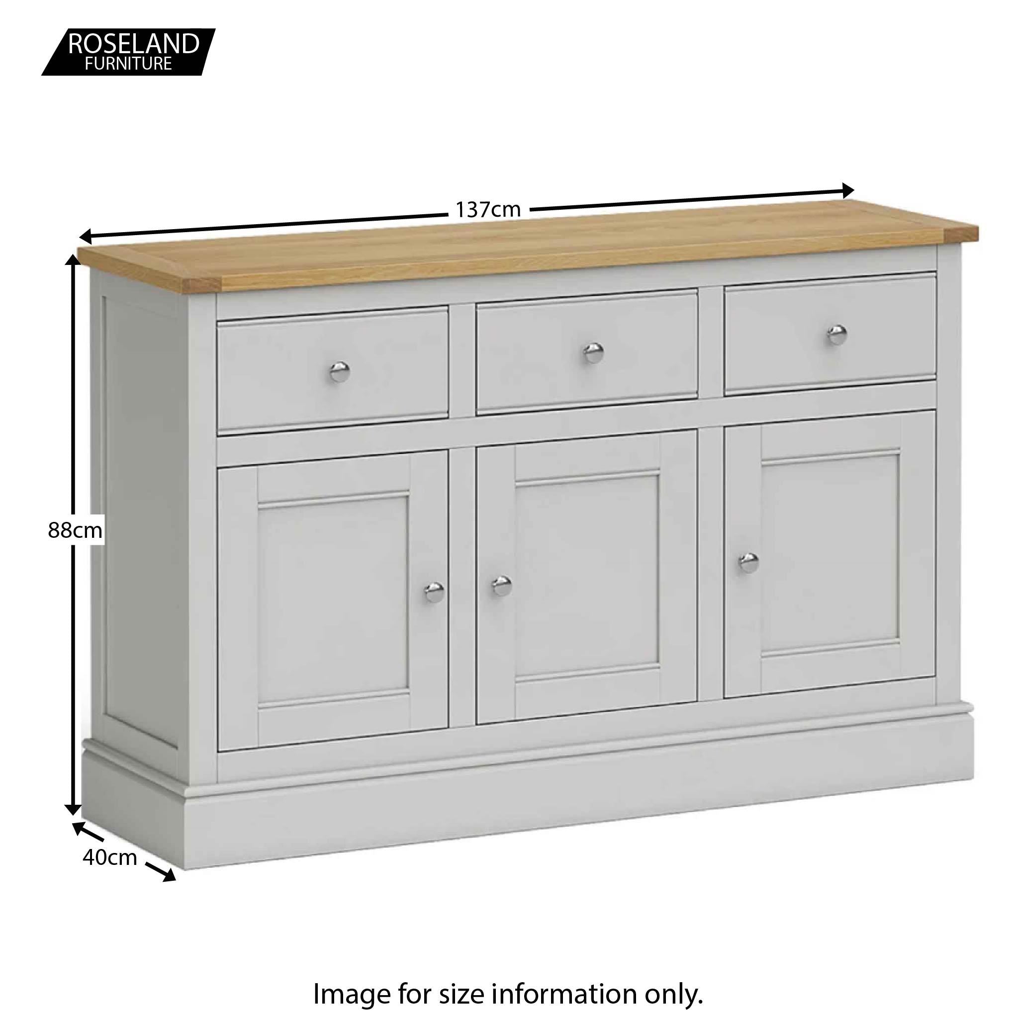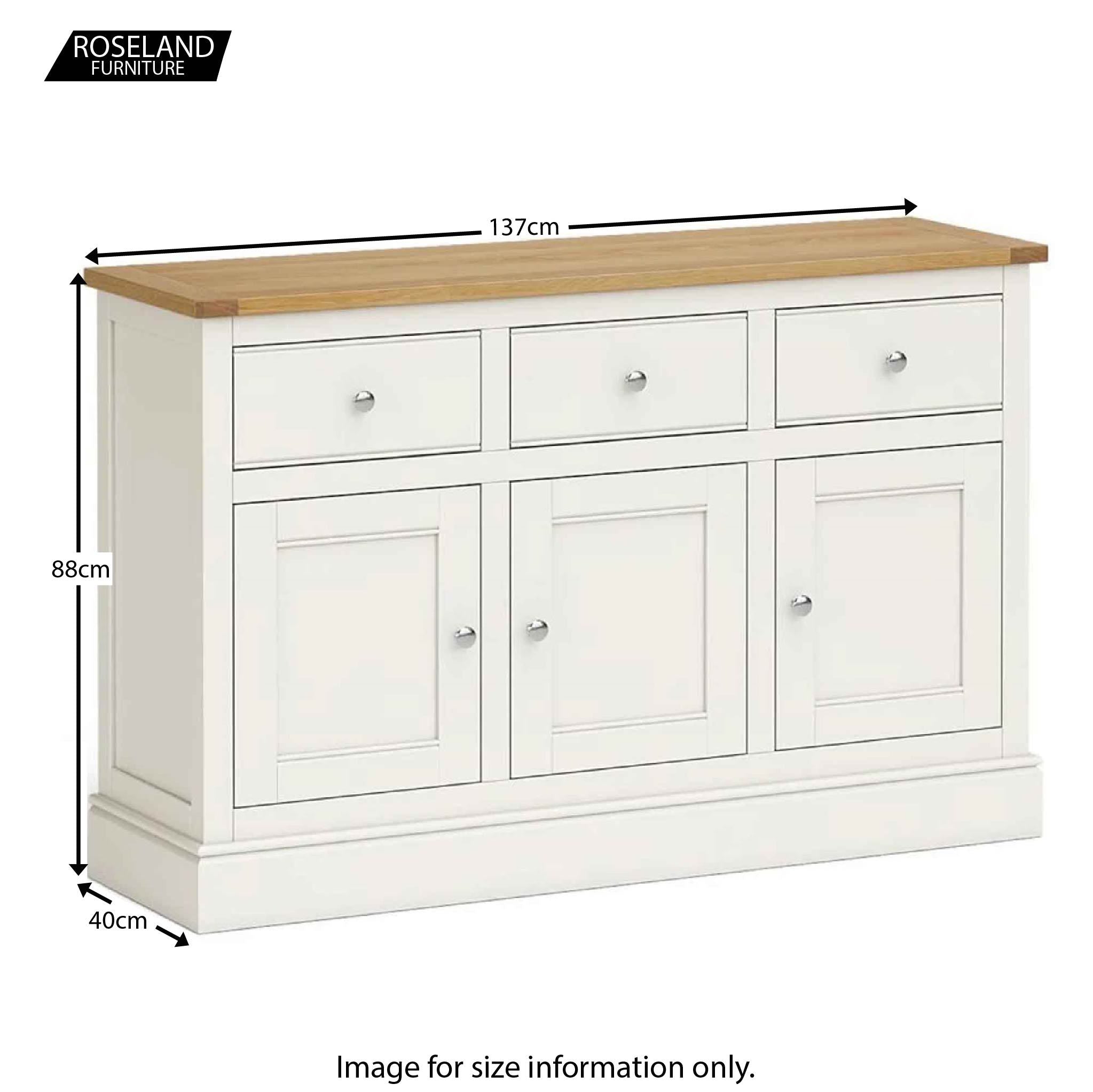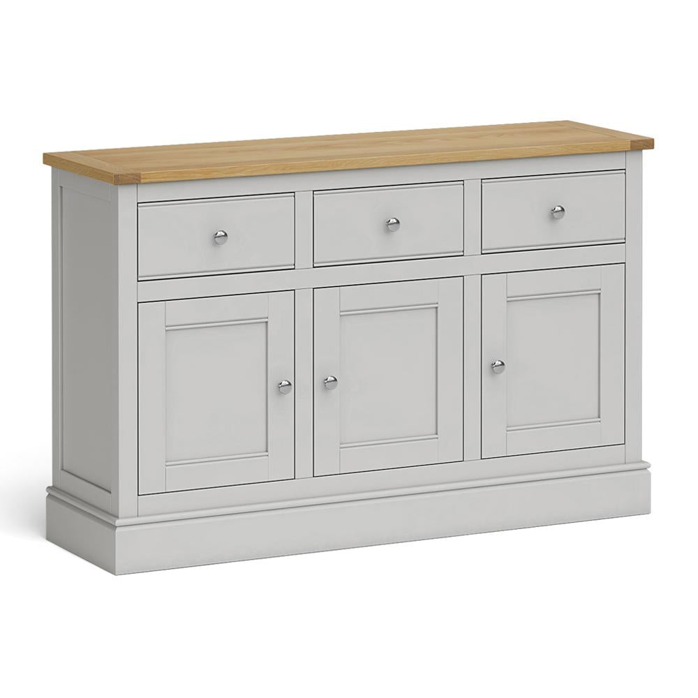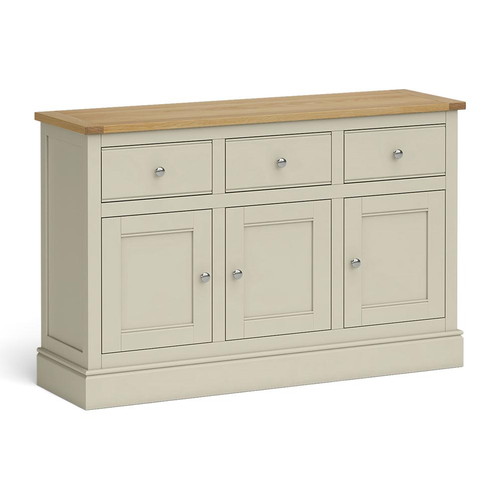 One of three sideboards in the Chichester range, this is the middle-sized of the three. With three spacious drawers giving plenty of storage space whether it's in the hallway, dining room or living room. The three-door cupboard has a fixed internal shelf that runs across the whole unit leaving plenty of space for crockery, DVD's or anything else you can think of.