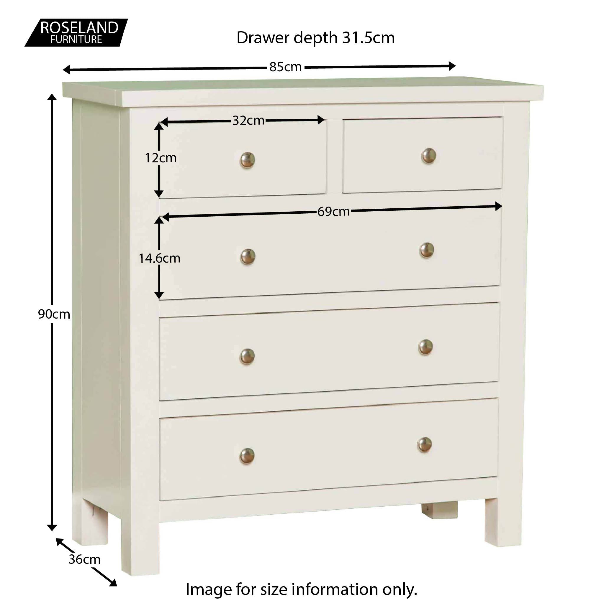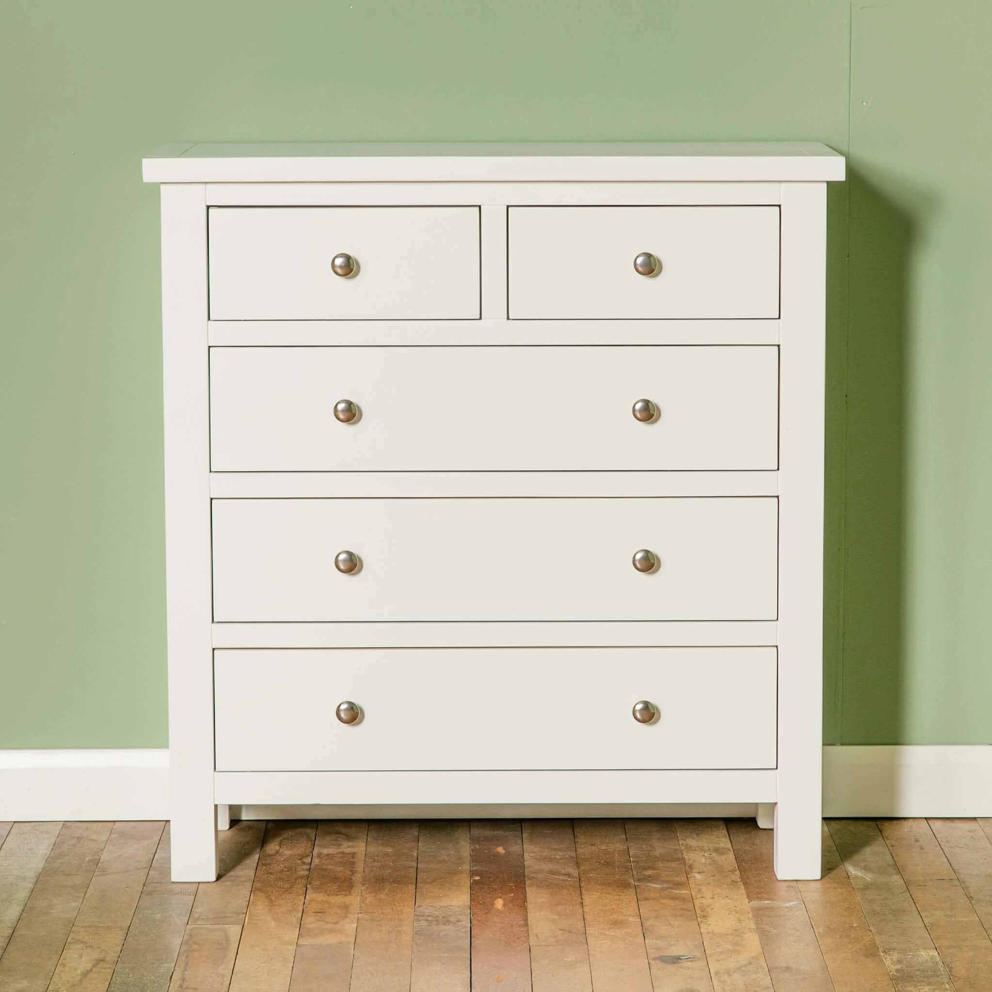 This 2 over 3 chest is part of our new Cornish White range. White furniture can brighten any room whilst creating a relaxing atmosphere, perfect for a bedroom. The 5 drawers provide plenty of practical storage and the large top surface is ideal for displaying pictures, flowers, or even a bedroom mirror.