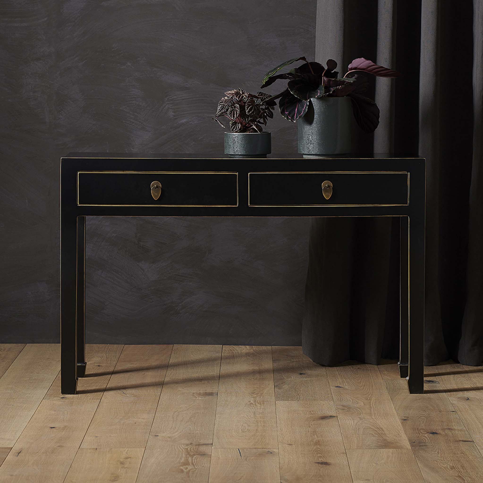 This stunning but practical statement piece will bring style to any sitting room or hallway. Built and finished to an extremely high standard, it's crafted from poplar and plywood with a rich black paint which is edged in gilt and has eye-catching handles to the drawers.