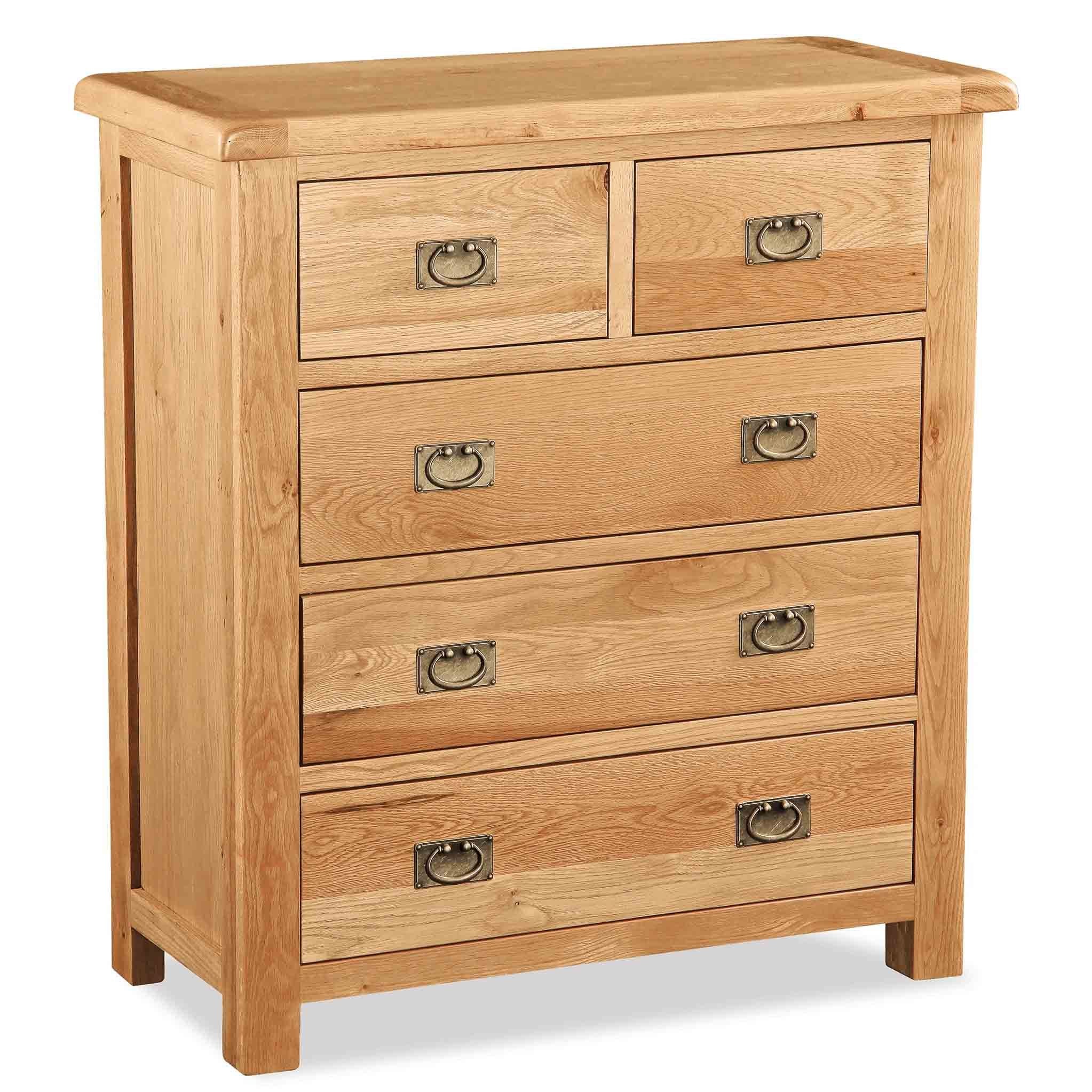 This Zelah large 2 over 3 chest is beautifully built with 5 deep drawers providing plenty of storage. Handmade from high-quality oak, the Zelah range adds a rustic touch to the bedroom. The rounded edges of each piece gives the room an impressive country look that only adds to the charm. If you are looking to find another item to perfectly match this chest, view our wide range of rustic oak bedroom items all of which complement each other beautifully.
