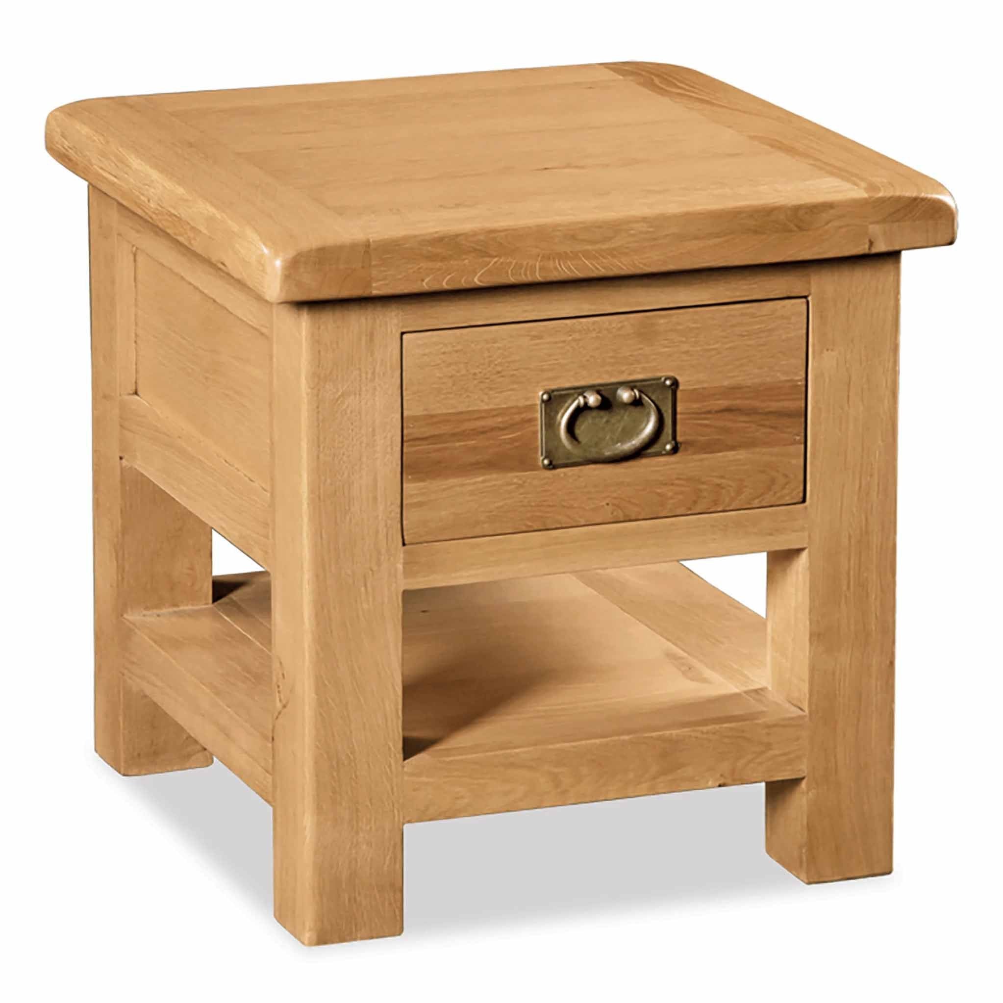 The Zelah Oak Lamp Table with Drawer is an ideal addition to any living area. It features a drawer for storage as well as a shelf below. Perfect for the living room as an additional coffee table or lamp table this item is handmade from high-quality oak. The rounded edges of each piece gives the room an impressive country look that only adds to the rustic charm. There are many more rustic oak items within the Zelah range that complement each other so please take a look around our shop.